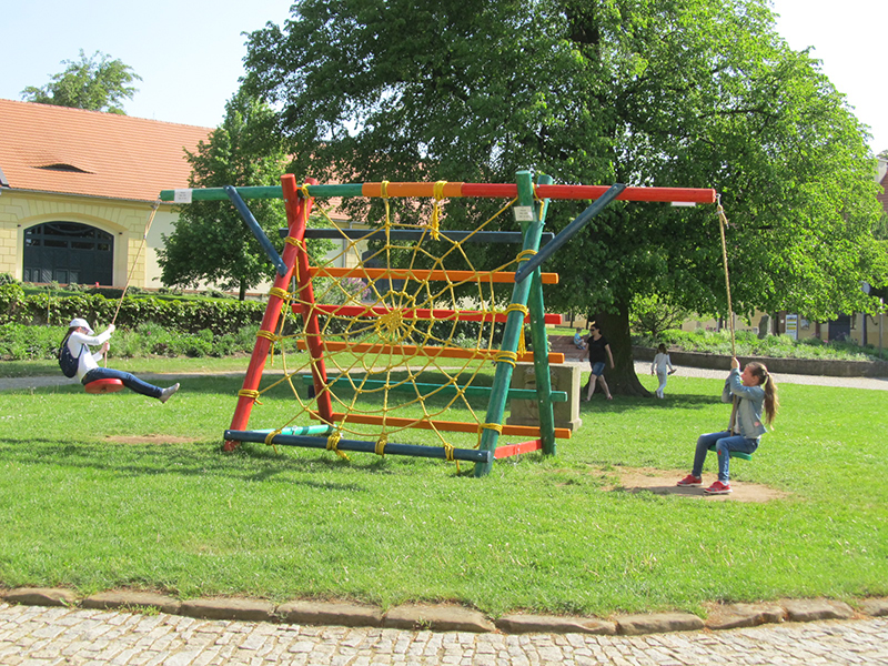 Protože nás přes léto čekají parné dny, objevila se v naší Zahradě barevná prolejzačka. Na prolejzačce - slovy naší velryby, je možno viseti, lézti, houpati se, spouštěti se, ručkovati, sluniti se, halekati, a jiné skopičiny prováděti...